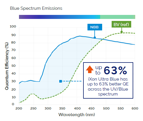 iXon Ultra Blueは、バックイルミネーション方式のセンサーを採用し、強化シリコンとUV最適化ARコーティングを組み合わせることで、UV-ブルー領域の感度を大幅に向上させています。標準的な「ミッドバンド」(BV)EMCCDセンサーと比較して、量子効率(QE)が最大63%向上しています。可視光から近赤外(NIR)領域にわたってQEが十分に高い水準を維持しているため、このカメラは極めて柔軟なソリューションとして活用可能で、例えば複数の種類の捕獲イオンや原子の発光イメージングなどに適しています。