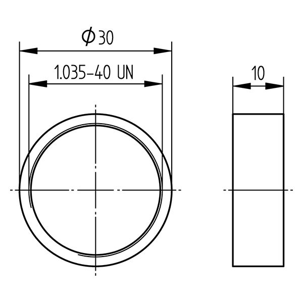 内部ネジ溝 1.035''-40 UNのネジ溝マウント付きのオプティクスを、内径 30mmのLINOSマウントプレートに取り付けるためのアダプターです。