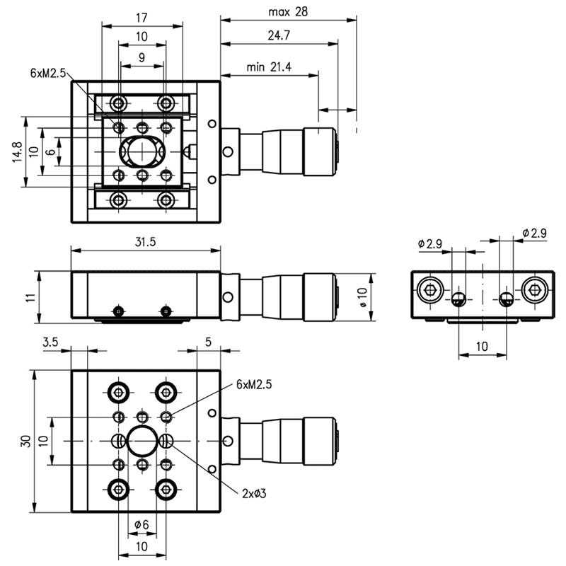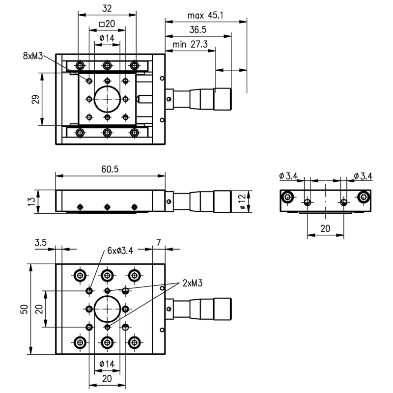 このポジショナは水平、垂直両方向でお使いいただけます。追加のマウントブラケットなしでXYZに組み合わせていただけます。異なるネジ穴が複数あいているのでLINOS製品との互換性もあります。