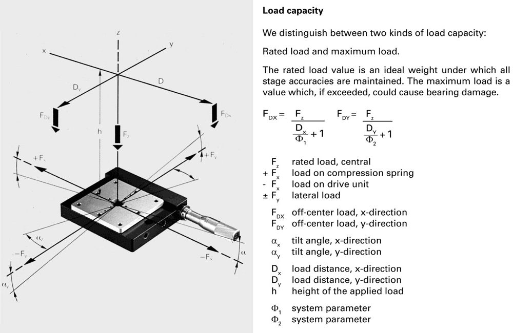| Part No. | Drive | Guide accuracy at load FZ (µm) | Guide accuracy, no load (µm) | Max. load +FX (N) | Max. load ±FY (N) | Max. load -FX (N) | Max. load Fz (N) | Rated Load FZ (N) | System parameter ⌀1 (mm) | System parameter ⌀2 (mm) | Deflection in αx (mrad/Nm) | Deflection in αy (mrad/Nm) | Repeatability at load FZ (µm) | Weight (kg) |