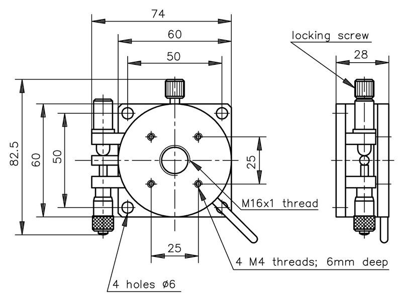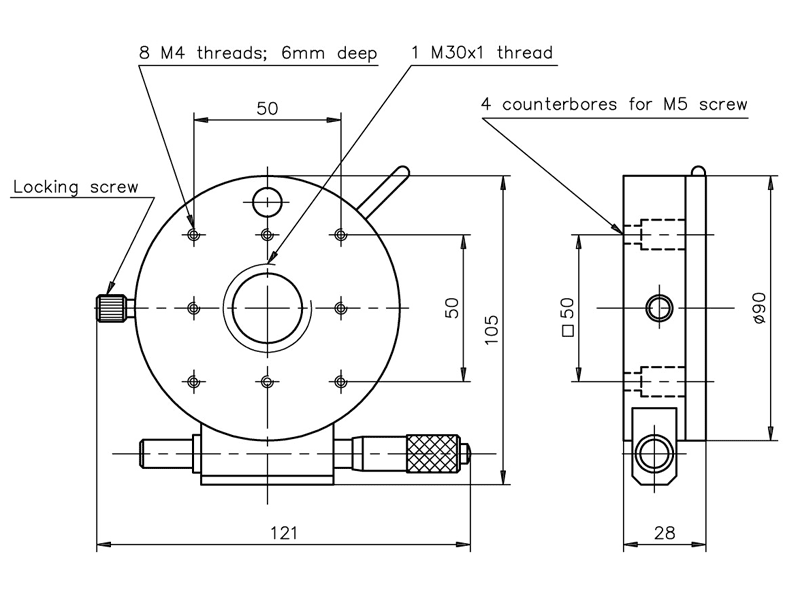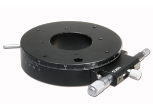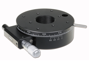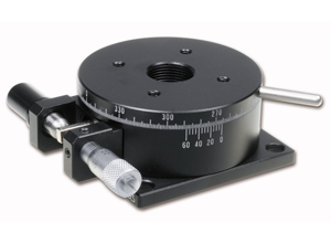 この小型回転ステージは、粗調整と微調整の両方で高性能位置決めをおこないます。粗調整はロッキングネジを緩めてから回転プレートを回転させることでおこないます。円周上の副尺付きスケールで、高精度の値の読み取りが可能です。微調節は、横方向にあるマイクロメーターネジをつかっておこないます。回転ステージはリニアポジショナと一緒にお使いいただけます。