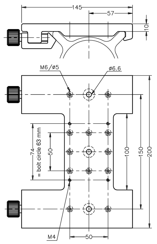 - 上面にM6 ネジ穴、50 mmの穴パターン