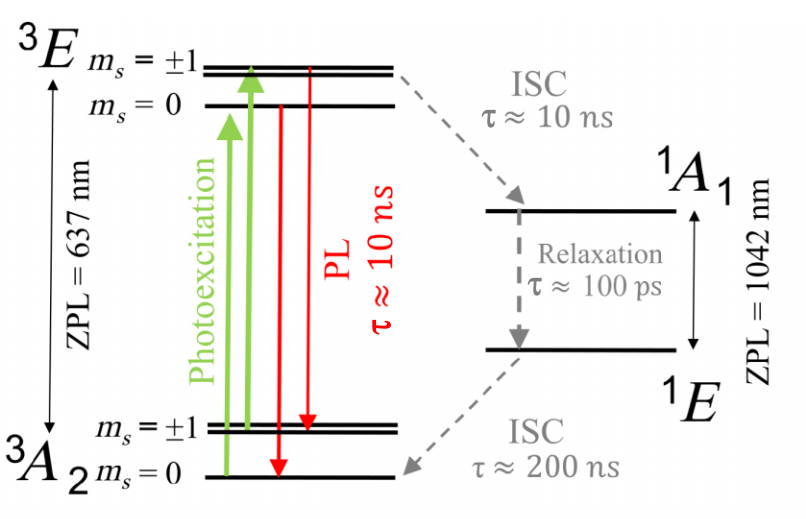 上:NVセンターは、スピン準位 0、-1、+1のサブレベルを持つ。532nmレーザーで励起された場合、初期のスピン状態に応じて異なる緩和経路をとる。