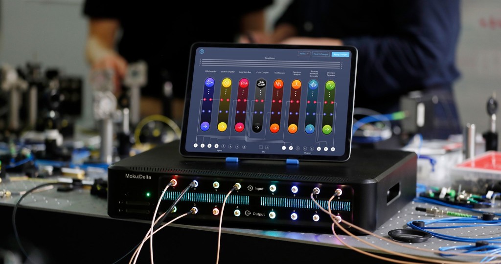 Moku の低レイテンシーでロスレスな相互接続を使用して、ケーブル配線や障害の少ない、カスタムテストシステムを構築することができます。 高度なデジタル信号処理により、実行中の機能を中断させることなく使用できます。