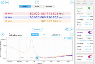 トップ 取扱メーカー 一覧 Liquid Instruments 共通技術情報一覧 機能一覧 フェーズメーター フェーズメーター 信号の位相を測定 Mokuシリーズの「 フェーズメーター 」は、最大 8 つの入力信号の基準クロックに対する位相を、 1 kHz ~ 2 GHz の範囲で、 1 nrad 以上の精度で測定します。 卓越したダイナミックレンジ、ゼロデッドタイムを備えた、 デジタル実装されたフェーズロックループアーキテクチャに基づき、 入力信号の位相・周波数・振幅を、高精度で継続的に追跡します。 \ アプリの「デモモード」で操作感を試してみる / アプリ ダウンロード 主な使用目的 電力システムの同期 通信システムの位相調整 電子テスト機器としての使用 アプリケーション 指向性エネルギー 重力波検出 干渉計 光学距離 発振器の解析 特長 組み込まれた時系列解析機能 アラン偏差、時系列データ、パワースペクトル密度、振幅スペクトル密度、レイリースペクトル、コヒーレンスを、重ね合わせてプロットします。追加の後処理は不要です。 GPSDOでクロック安定性を向上 Moku:Deltaに搭載の「GPSDO(GPS Disciplined Oscillator:GPS基準周波数発生器)」を使用することで、1ppbという低クロック安定性とPPSタイミング同期を実現します。 複数機能を同時に実行 マルチインスツルメントモードを使って、スペクトラムアナライザ、またはオシロスコープと組み合わせれば、ロスレスな信号検証を行うことができます。 マルチインスツルメントモード 仕様 モデル Moku:Go Moku:Lab Moku:Pro Moku:Delta 入力チャンネル数 2 ch 2 ch 4 ch 8 ch 周波数範囲 1 kHz ~ 30 MHz 1 kHz ~ 200 MHz 1 kHz ~ 300 MHz 1 kHz ~ 2 GHz 位相エラー 1.1 μrad/√Hz @ 10 Hz 0.9 μrad/√Hz @ 10 Hz 0.5 μrad/√Hz @ 10 Hz ー トラッキング帯域 最大 100 kHz 最大 100 kHz 最大 1 MHz 最大 1 MHz クロック参照オプション ー ー ー 10 MHz, 100 MHz, GPS データシート 技術動画 なぜ位相を測定・ロックするのでしょうか? 位相検出にデュアル位相ロックインアンプを使用する 位相ロックループ(PLL)による位相測定 Moku フェーズメーターでアラン偏差を測定する Moku フェーズメーターで位相ロックループ(PLL)を構築する方法 Moku フェーズメーターの使用方法 オシロスコープ / 電圧計 ファンクションジェネレーター スペクトラムアナライザー 任意波形発生器 データロガー フェーズメーター ロックインアンプ レーザーロックボックス 周波数応答アナライザー PID コントローラー デジタルフィルターボックス FIRフィルタービルダー タイム&周波数アナライザー ロジックアナライザ & パターンジェネレータ マルチインスツルメントモード Moku Cloud Compile Moku ニューラルネットワーク AI 生成機能(Generative Instrumentation)