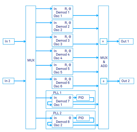 2つの低ノイズ入力、6つのデュアルフェーズロックインアンプ、2つの PLL、4つの汎用 PID コントローラー、および2つの信号発生器が利用可能で、必要な機能を提供するために組み合わせることができます。