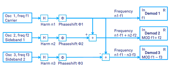 これにより、サイドバンド f1 + f2 および f1 - f2 の信号を直接復調できます。発振器周波数 f1、f2、f3 のいずれも動的にすることができ、それにより、たとえば PLL または外部リファレンスによって制御されます。