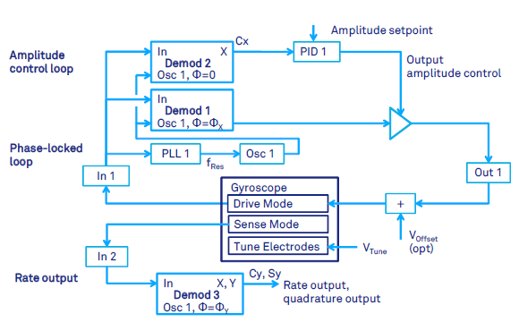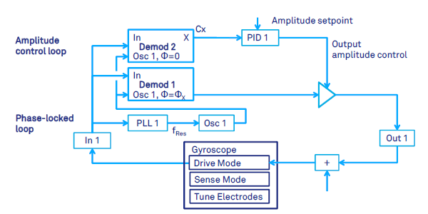 センスモード振動の速度と直交は、復調器6によって測定され、それぞれPID 2 および PID 3 によって制御されます。