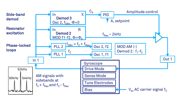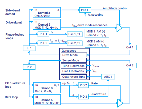 単一の HF2LI デバイスには、最適なパフォーマンスを実現するために、固有の共振器周波数にロックされた PLL、強制リバランス制御、直交制御ループ、キャリア変調技術でドライブおよび振動モードを制御する機能が含まれています。