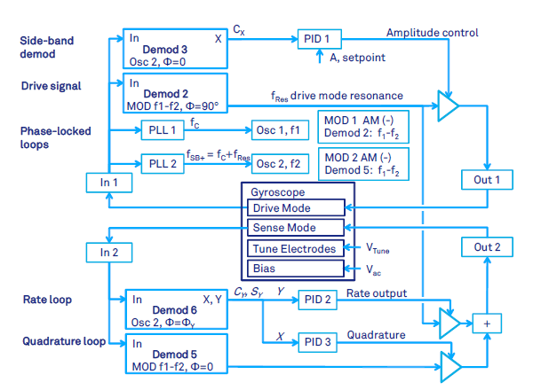 複数の制御ループを並行して実行する必要があるため、振動ジャイロスコープの制御は複雑です。 さらに、最高のパフォーマンスを実現するには、セットアップ全体で高精度で低ノイズの電子機器が必要です。