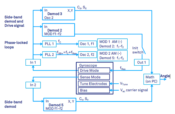 図7. クローズループドライブモードおよびオープンループセンスモード測定を備えたジャイロスコープ制御。 ドライブモードは、PLL と AGC によって制御されます。ジャイロスコープの出力は、ドライブモードの PLL と同じ周波数で動作する復調器によって測定されるセンスモードでの発振です。